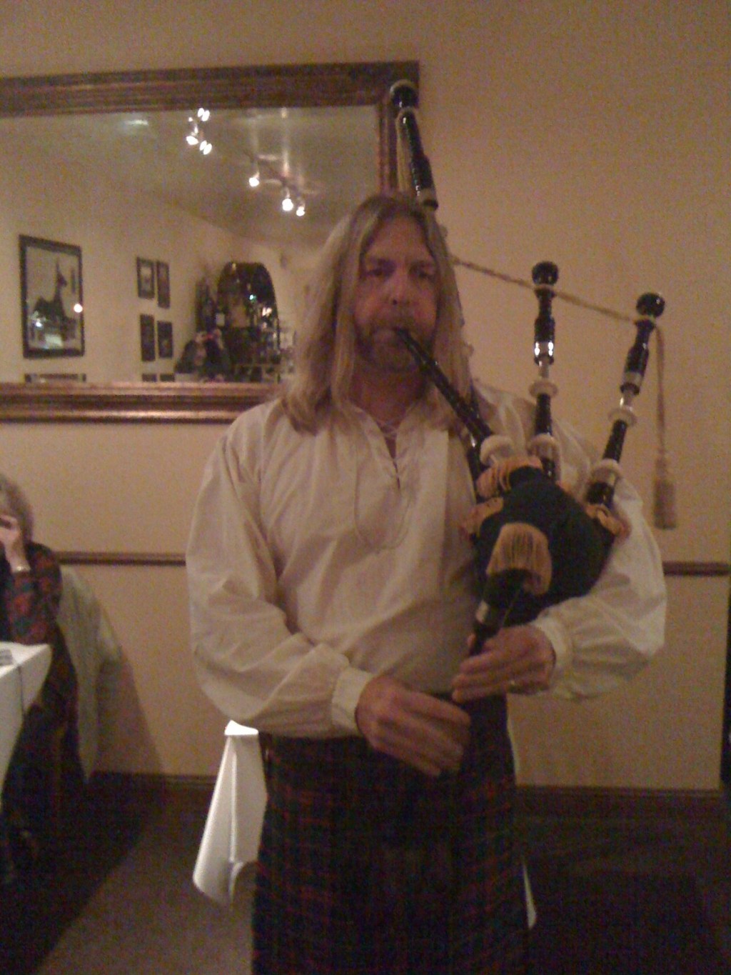 Tonight we proved that the bagpipe is not an indoor instrument–or at least that it requires a much larger room than this restaurant. Wow, is it loud. There were Scottish dancers, too, and poetry reading in the original Scots.