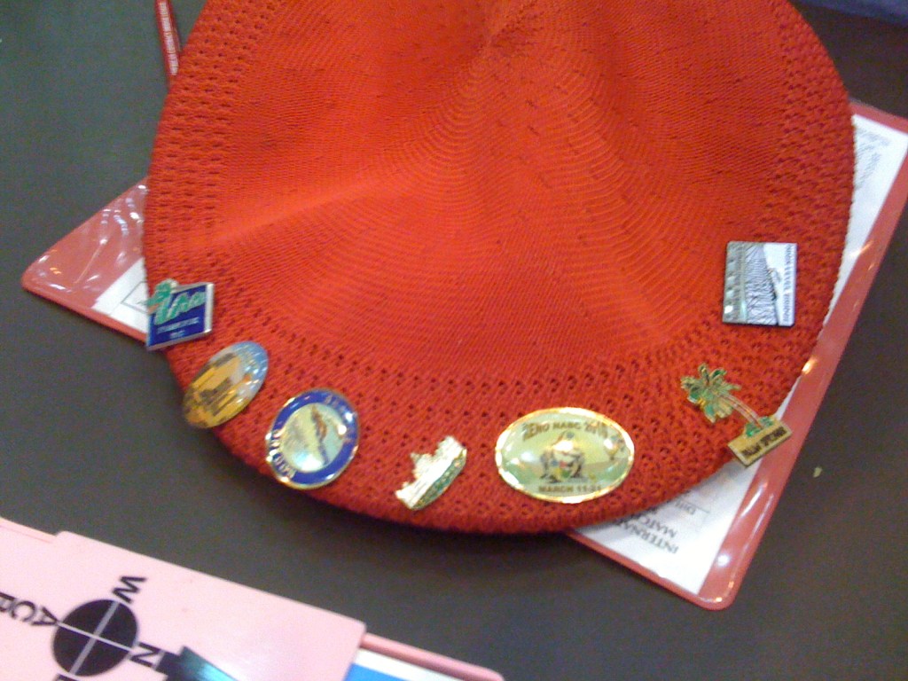 They didn’t always have the hats, but at some forgotten time in history they appeared. The team has a rule: they only buy a pin representing a city if they win an event. And there are a lot of pins in that hat.