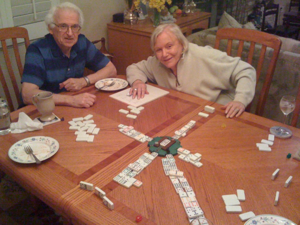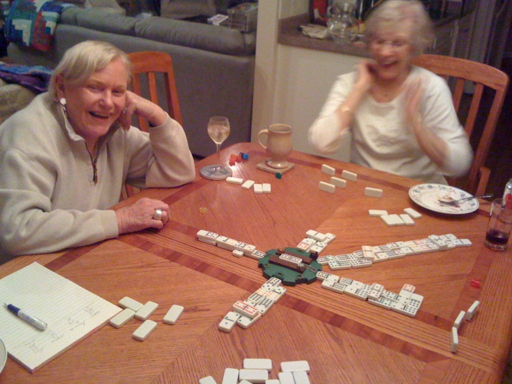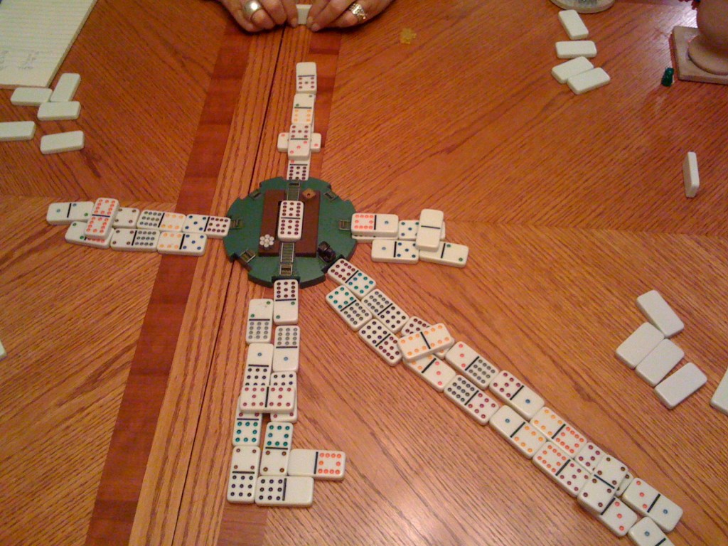 Then it was time for the Mexican Train. If you haven’t played this silly game, it’s a dominoes variation. The usual matching of dots is eased by having color-coded tiles for those of us who can no longer see across the table to discern whether that is 11 or 12 spots. Everyone plays their own “train”, or they can play on the joint “Mexican Train”, as they choose.
