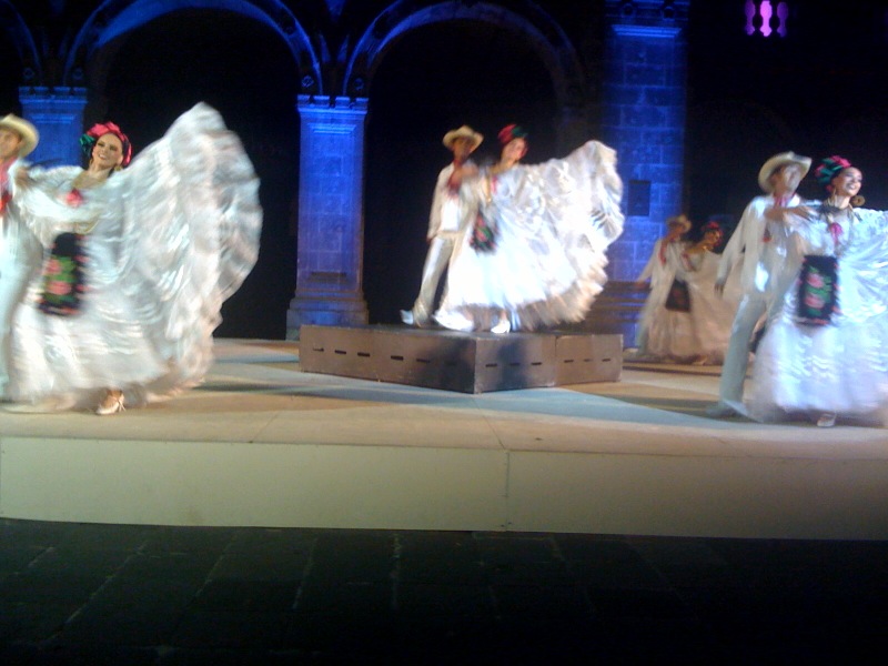 From Aztec dance, the program moved to the Spanish influence. There were many numbers featuring handsome men in high-waisted pants and pretty girls in very full skirts accompanied by a 10 piece Mariachi band. Something I have never heard before was a harp solo, played entirely pizzacato. There was an interlude for costume change where we were entertained by a 5 man xylophone, surely one of the world’s largest.
