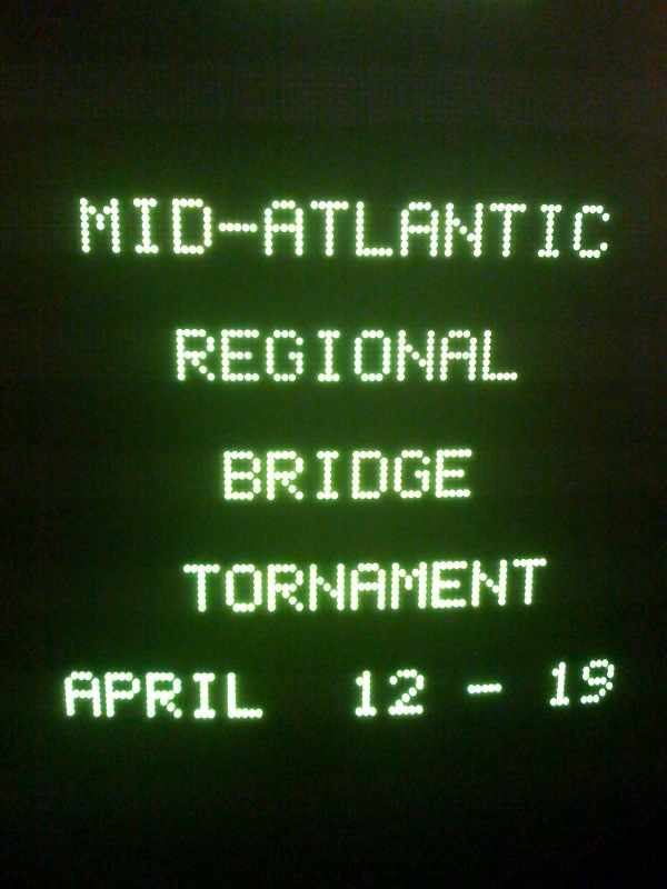 We won our first match in the morning KO today, so we go back to battle at 9:00 am.  Then Bob Munson and I will play pairs while the other 4 start a new KO.  Bob has a wedding in Nashville this weekend, and I’t going to one in Atlanta, so we can’t play past tomorrow.