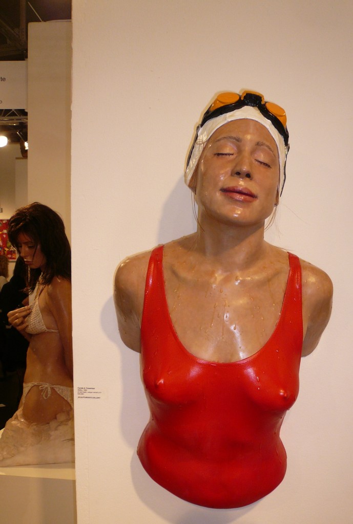 This hyper-real sculpture is offered at $38,000. The cutie in the bathing suit on the left is $55,000, but she has arms.