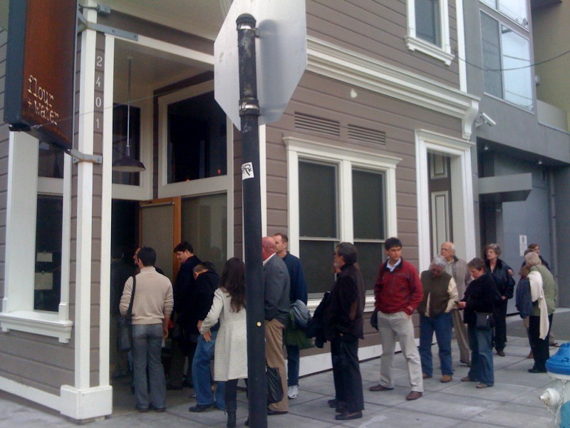 Reservation for 5:45. Too early, to be sure, but the only one available for such a hot place–and we made the reservation weeks ago. We left early in case there was traffic trouble–the Prez is in town to raise money for Barbara Boxer, which isn’t good for the rest of us peons when it comes to traffic. But the Prez was downtown and we weren’t, so no problem. We got there at 5:25, and saw this huge line of people waiting to get in. Turns out they offer reservations for half of their tables, and walk-in seating for the rest. Hence the line. The walk-ins mostly get either the bar or a large communal table, we at least had a table for ourselves.