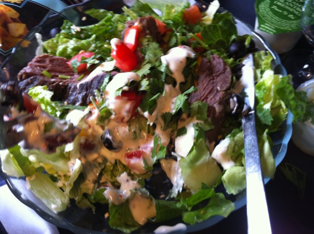 This was a huge chicken/cheese/roasted pepper sandwich on some special bread. It was fantastic, but then so was Gail’s Fajita Salad: