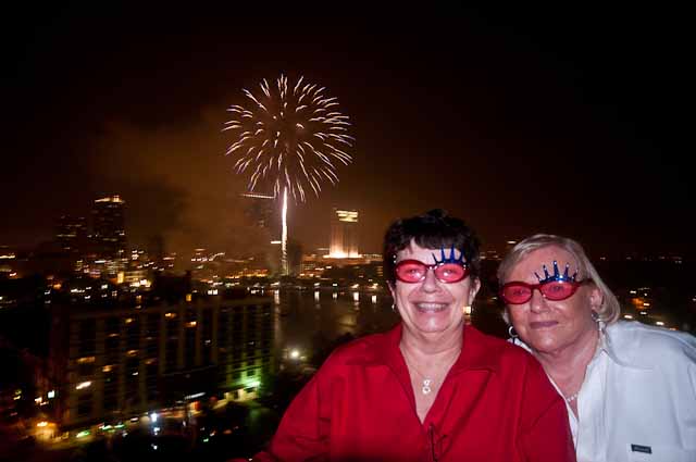 Then, about 9:30, the city of Orlando sets off **its** display, right across the street from where we are all partying on the balcony. The experience is just breathtaking–the huge explosions echoing in the concrete canyons of the city, the smell of cordite, the almost endless procession of awe-inspiring pyrotechnics.