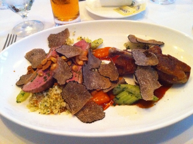 My entrée was the Liberty Farms Duck breast, to which I added the summer truffle supplement. The truffles were something new for me, but what’s life without adventure? They are much lighter in flavor and aroma than the winter truffles, but they cost about 1/5 as much, too. In any event, I enjoyed them, as did Barbara Jacobson, who had them on her lamb.