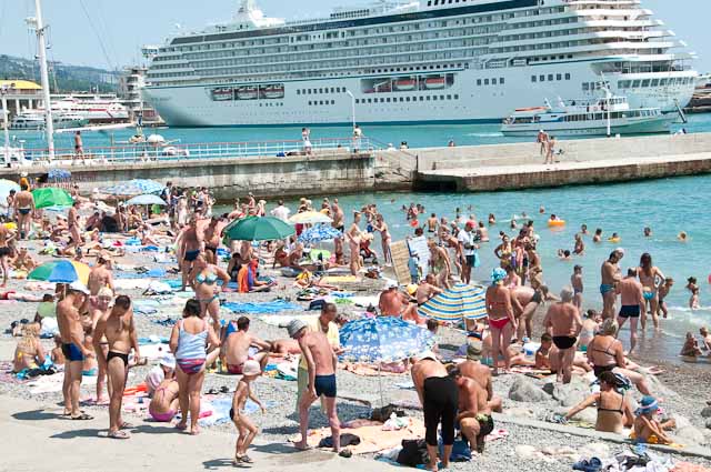 Walking along the waterfront is interesting because of the people. There are thousands of tourists here from all over Ukraine and Russia, who flock to the tiny areas of “beach” as early as 6:30 in the morning to begin cultivating their skin cancers. The men wear tiny speedos, even the guys built like me. That’s not a good look, by the way. The women aren’t wearing much more, but that bothers me less. The beach is jammed, the water is jammed, it just doesn’t look like fun to me but thousands of them are doing it so I guess it’s alright.