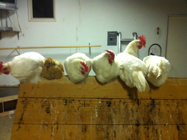We always worry if new birds will get along with the ones we already have, so I was gratified and amused to look in the garage tonight and see the five new birds roosting on the ridge of the coop, joined by one of our two babies.