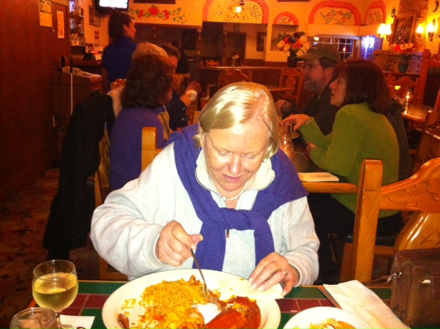 Gail had the classic combination plate–an enchilada, a taco, a tamale. Rice and beans (except she orders all rice). Tortillas. She didn’t exactly rave about the food, but I noticed she took the leftovers home for breakfast.