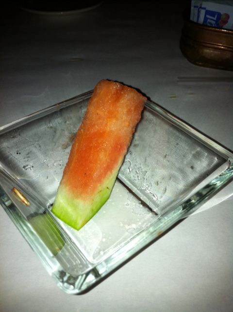 Dinner tonight at our favorite, Nibblers. As is his custom, Chef Daniel presented us with an amuse bouche, in this instance a small, perfect piece of watermelon.