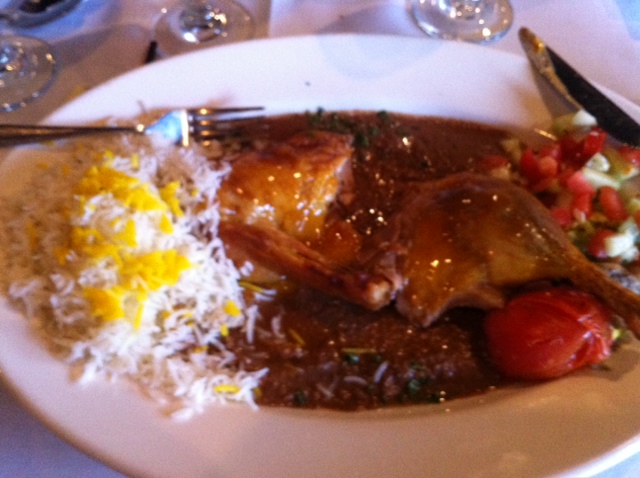 My dish was half a duck, in orange sauce, with rice and some non-specific brown soupy matter, plus vegetables. I liked the duck, mixed the rice with the brown soupy matter and smacked it down. One doesn’t think of duck a l’orange as a Persian dish, but there you have it.