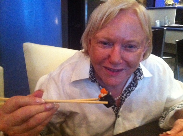 Gail is slowly coming around to liking sushi, and this time we even got her to try the chopsticks. Here she is enjoying her very first bite of food in the Asian fashion: