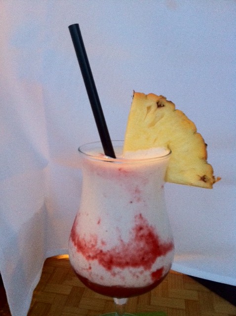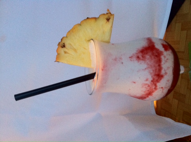 However. The waitress noticed us hold up napkins trying to make a decent photo, and I told her about the Totally Unofficial blog’s quest for the perfect Lava Flow. So when the second one came (because you really have to try two to make sure), I think she had a word with the barkeep, because it looked a trifle better: