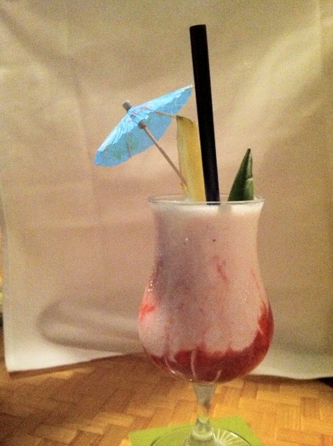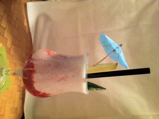 Notice that this one has the blue umbrella–the mark of a great drink, I should think. The green thing is a frond from the top of a pineapple–you can’t eat it and trying to lick the drink off it will shred your tongue, but it’s the thought that counts.