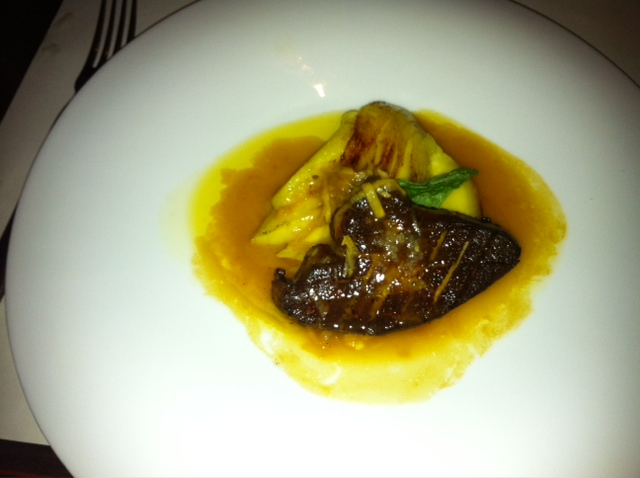 I started with the foie gras, a particular weakness of mine. It’s pretty much impossible to OD on, because it is on so few menus. This dish was interesting because it was served with roasted mango, something I’ve not seen before. You need the intense sweetness to balance the richness of the goose liver, and foie gras is often served with a fruit confit of some sort. This was better.