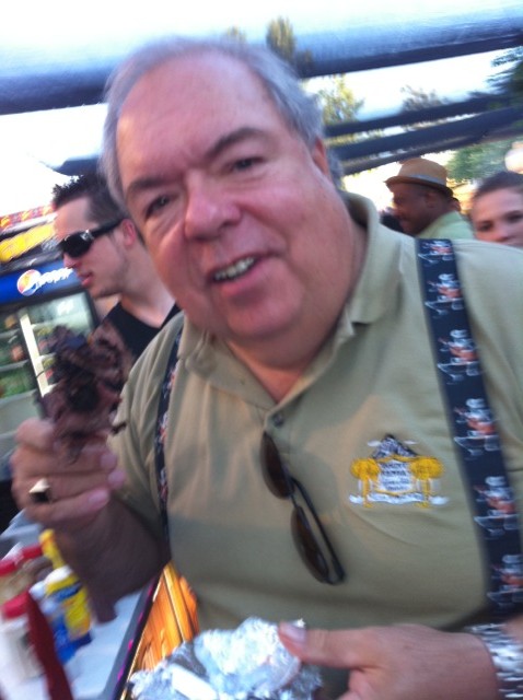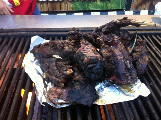 It took a while to find Jungle George, but perseverance pays off and soon we were in front of the grill, stacked up with racoon carcasses grilling away.  I paid my $7.75, and got a skewer stacked with the red meat, and the moment of truth had arrived.