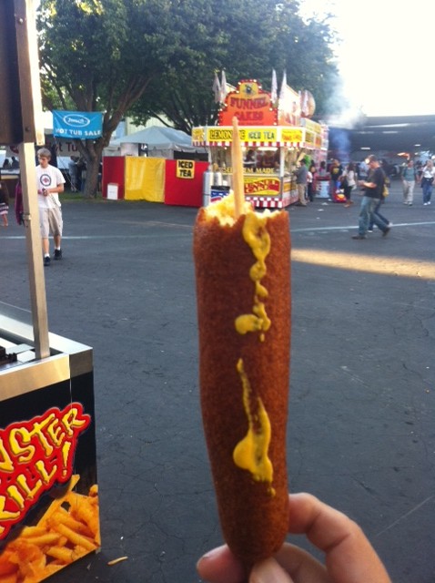 I chose the corn dog.  Obscene in every way, there’s something about an enormous dog covered in corn meal and deep fried that speaks to my heart–which we shouldn’t tell the cardiologist.
