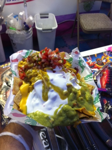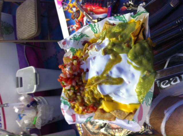 Holding my sides from laughter, we headed out the gates for home.  But first Gail had a taco.  Then we passed the stand with the nachos, and she wanted those, too.  Just nachos, no meat.  But there’s no discount for no meat, so it set me back $9.75 for a plate of chips and guacamole.  They were great nachos, at least the 3 chips Gail ate before she realized that this was a mistake of epic proportions and tossed the entire plate.