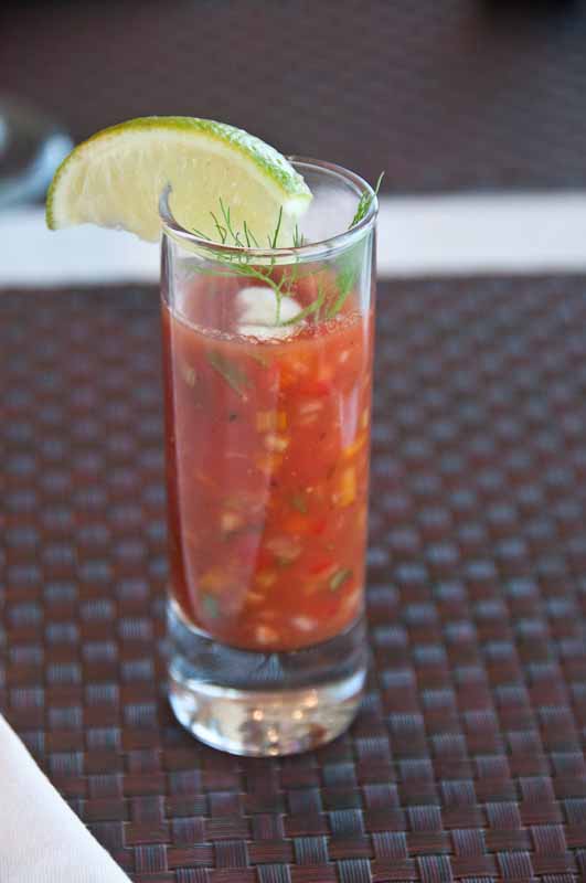 My amuse bouche–an heirloom tomato gazpacho shooter.