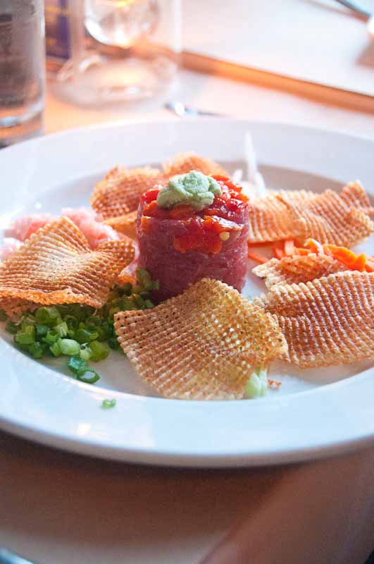 David, at least, had something healthy–the tuna tartare. A lovely presentation of a tower of the raw fish with waffle cut fries to scoop it up with.