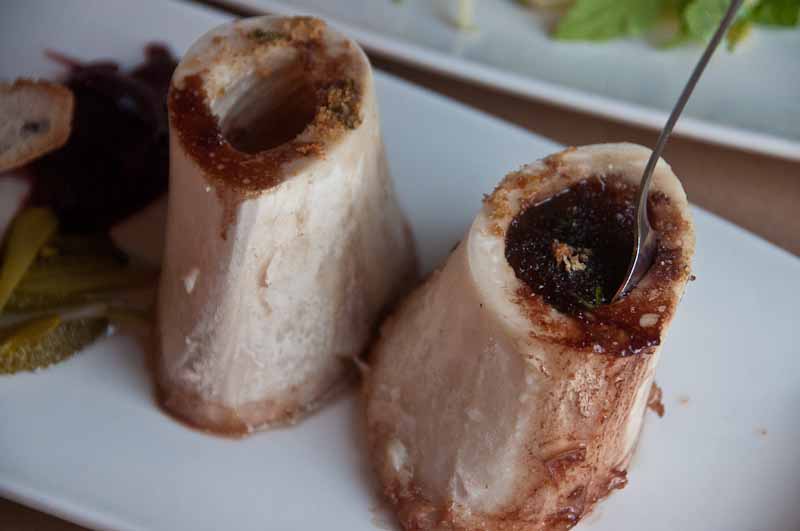 Gail had the marrow bones–another dish that’s almost all fat, hard to find on menus and extravagantly delicious. This portion was so large that Gail and I both couldn’t finish it, although it seems criminal to leave any. The soft, creamy marrow, spread on stiff crackers, is a delight you should try in the rare event that it is available.