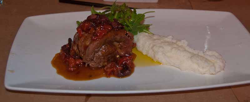 My entree was the breast of veal, but not like the one mother used to make. This was just the sheet of tender veal, removed from the ribs and rolled, then dressed with a sauce/dressing of roasted peppers. The mashed potatoes were napped with olive oil, for a different and exciting presentation. I haven’t had a breast of veal in years, and this was just delightful.
