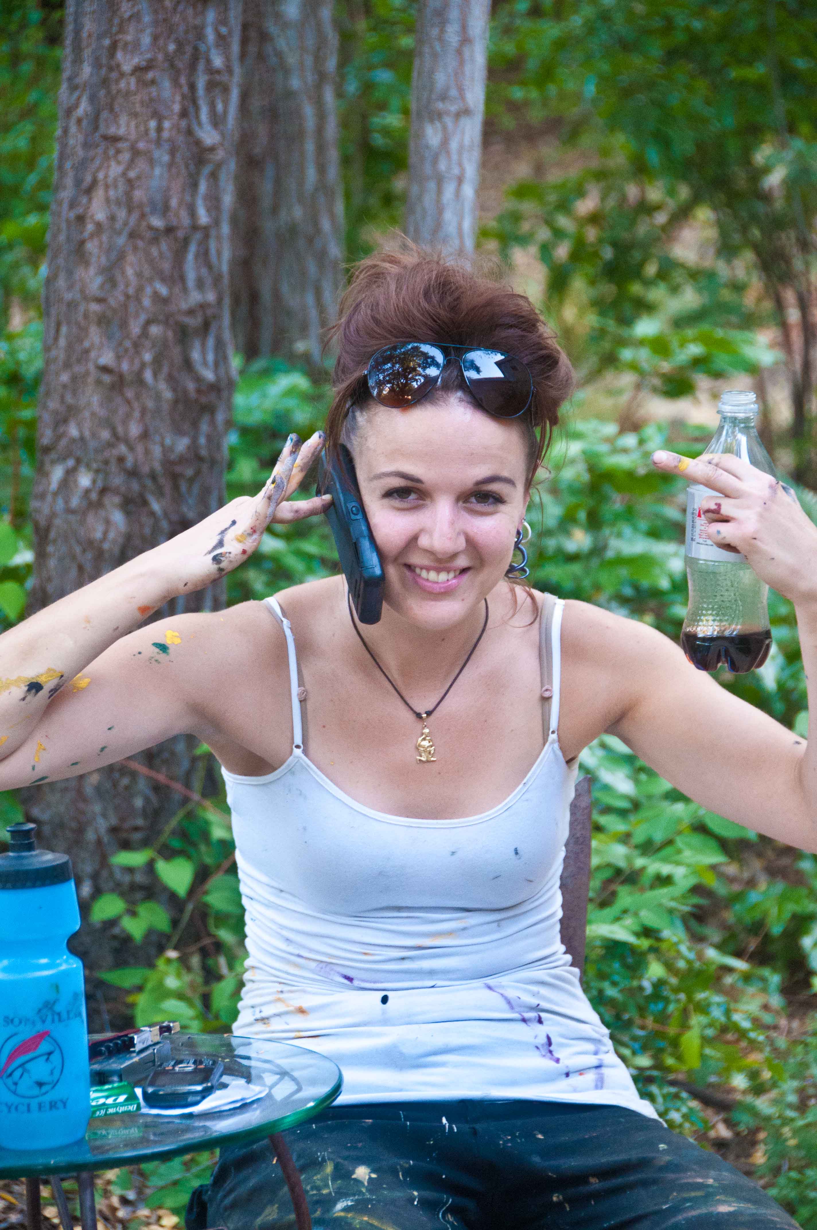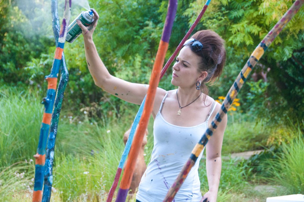 Why is there a beautiful, paint-covered young woman in my yard? Because I had arranged to have the artwork she and her father created re-habbed, and then forgotten that Tuesday was the day. Turns out they had been working for 6 hours already, and were about to finish up.