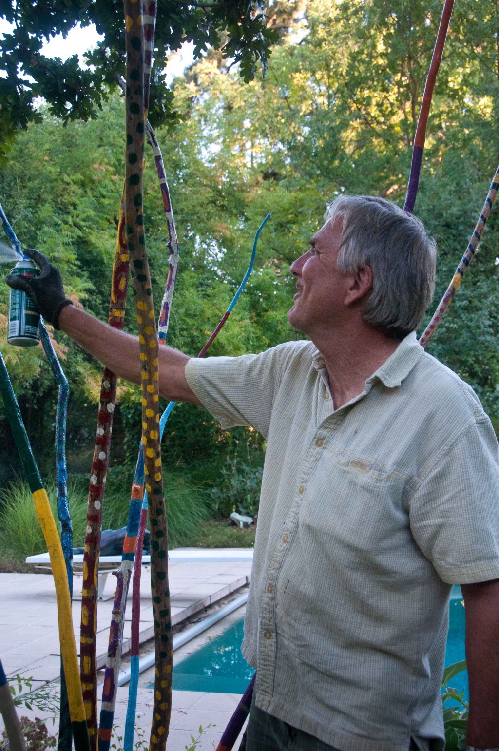 The work consists of 11 pieces of wood, perhaps 7 or 8 feet long, painted brightly and stuck in the ground. It strikes me as vaguely African, and is one of my favorite pieces. We have owned it for 5 years, and the paint was flaking off; it needed some major work.