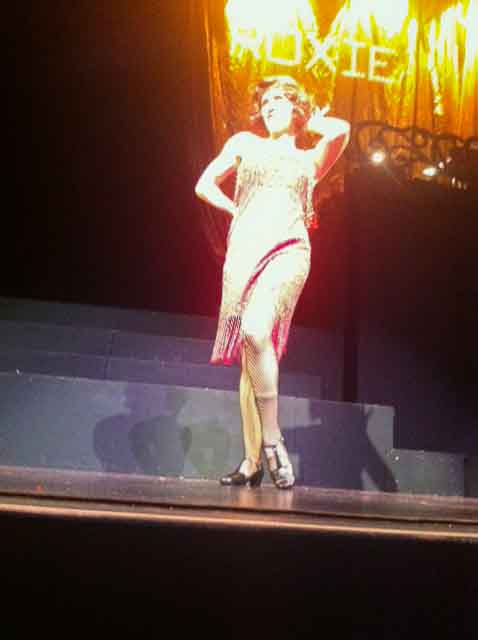 The lighting effects were excellent and dramatic for such a small theater. A mylar sheet on the back wall stage left became many different colors and looks just by changing the lights. You can see it here in a photo as Joy Sterratt sings “Roxy”: