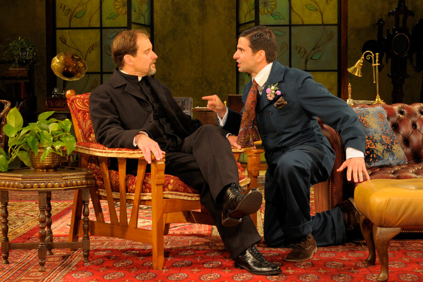 Candida is the story of a minister, James Morell (Anthony Fusco), and his wife, Candida (Julie Eccles). Her young friend/compatriot/protege Eugene Marchbanks (Nick Gabriel) (a mooney 18-year-old afraid of his own shadow) decides that not only is he in love with Candida, but that she is in love with him and stays with her husband only because of the beauty of his preaching, and so informs the husband. Morell is stunned at this declaration, afraid that his wife loves him not for himself but for his works. He leaves the two alone, then forces her to make a choice. Not surprisingly, she chooses the mature, successful man she married, but only by first disparaging him as the weaker and needier of the two. Shaw was an early feminist; man-bashing was as topical then as it is now.