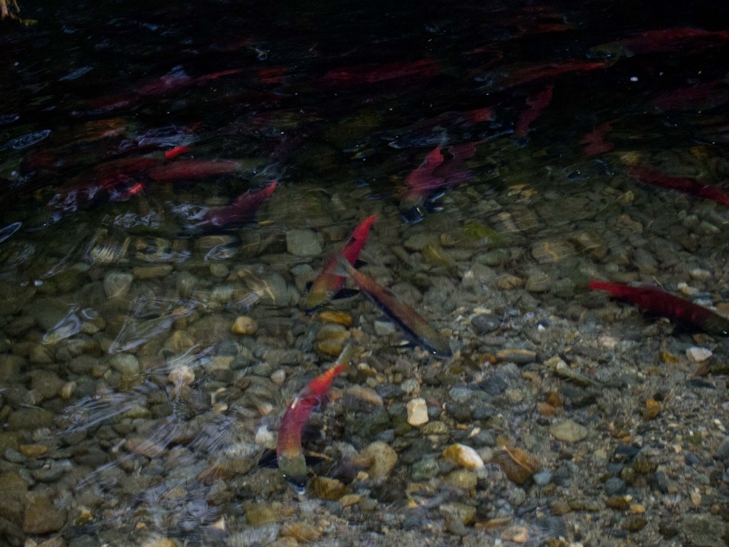 These are kokanee salmon, little guys you won’t ever find on your dinner plate.  They’re mostly red; the females have greenish heads, the males are a bit larger and have a humped back, which they develop just prior to spawning.  If you need more fishy details, ask Lorin Waxman, he’s the fishiest guy I know.