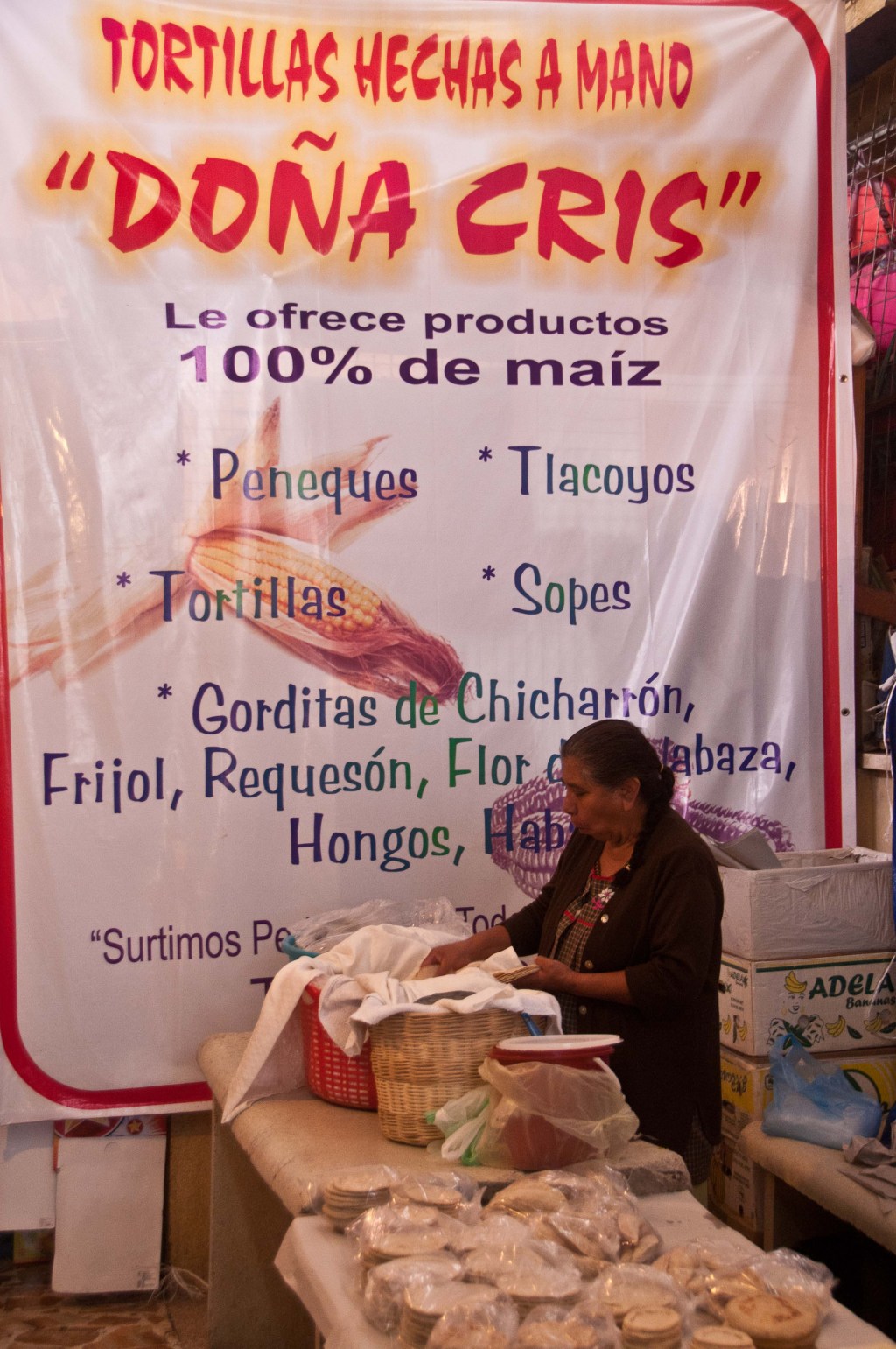 One of the larger stalls. Blue corn tortillas, which are special and cost extra in the states, are common here,