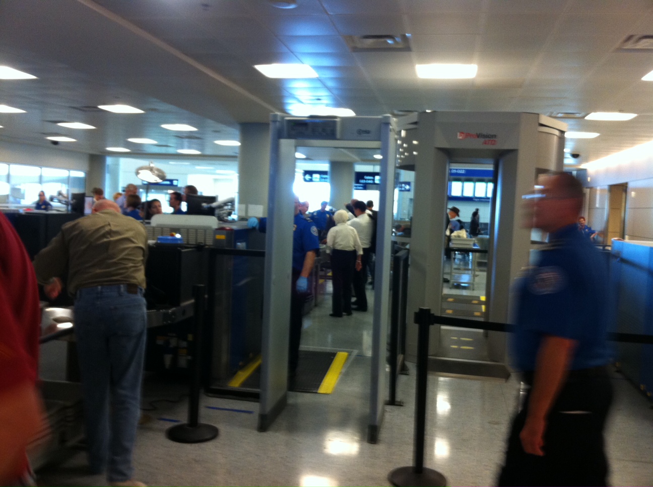 A woman ahead of us must have set off the metal detector, because they were preparing to “pat her down”. She won’t need to see her OB-GYN for another 6 months. REMEMBER: if you are ever “selected” for gate-rape, you have the right (if you can use the word “right” when discussing the TSA) to insist that they at least put on new gloves. If they won’t buy you champagne and roses, it’s the least that they can do.