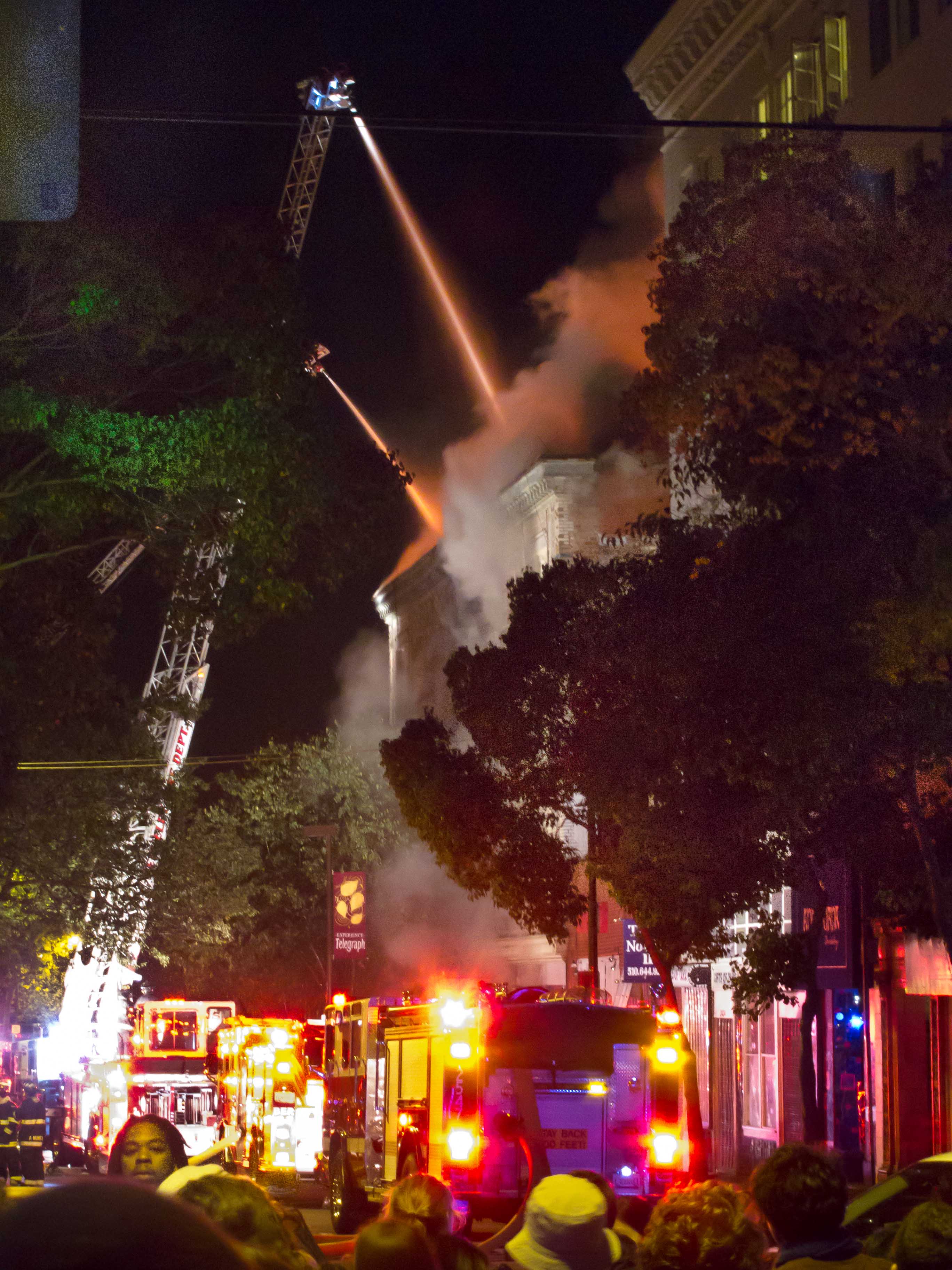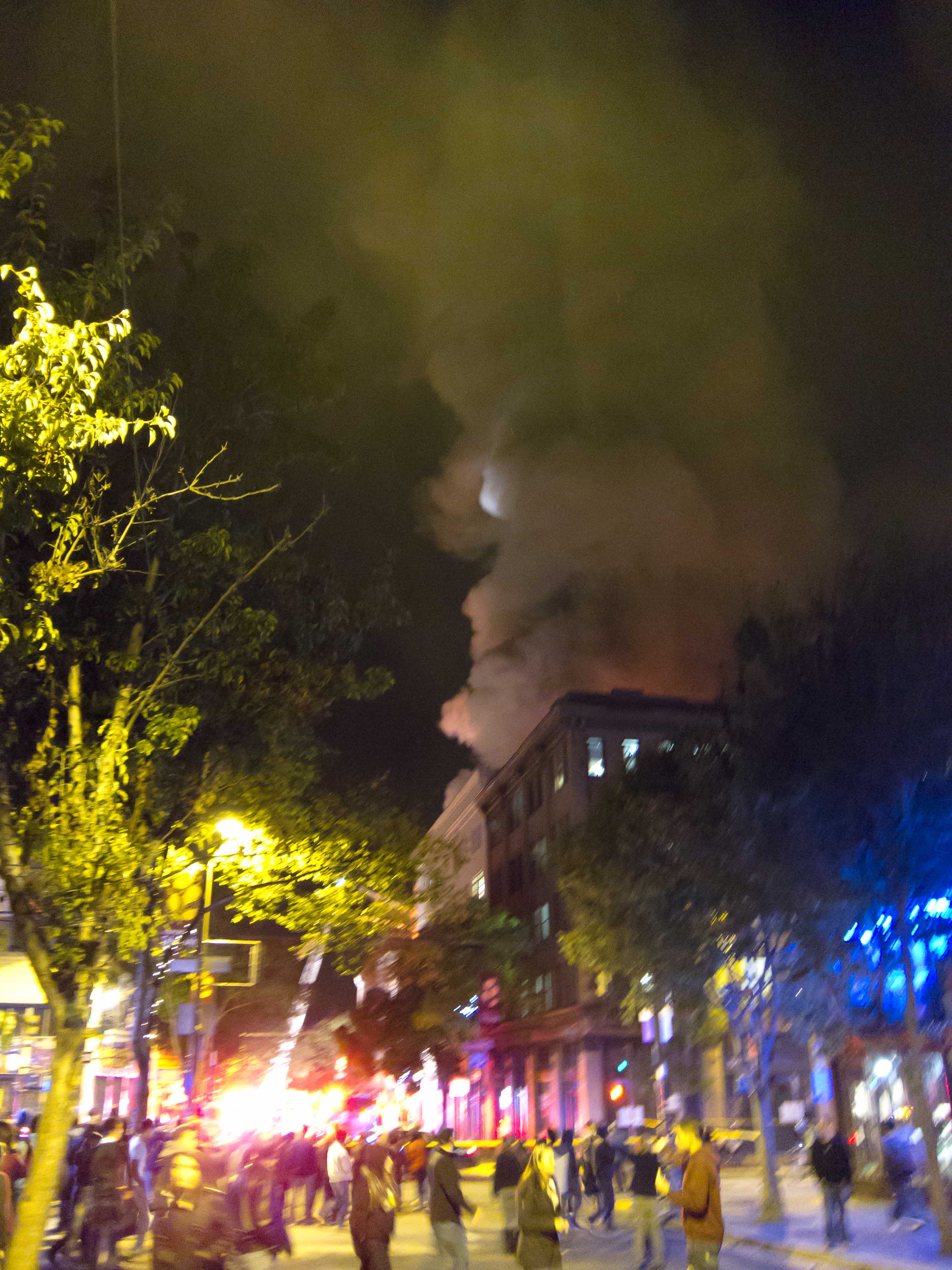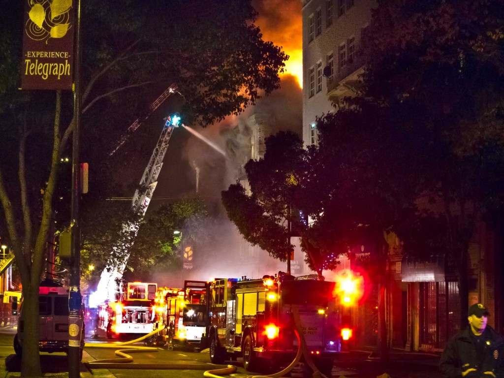 It turned out to be a huge challenge just to get there–our garage is on Channing Way, and the street was blocked by the police. At first I thought it was a civil disturbance, perhaps the Occupy people, but I was wrong. The apartment building on the corner of Telly and Haste was in flames. Big flame, this was no wastebasket fire it was the real thing.