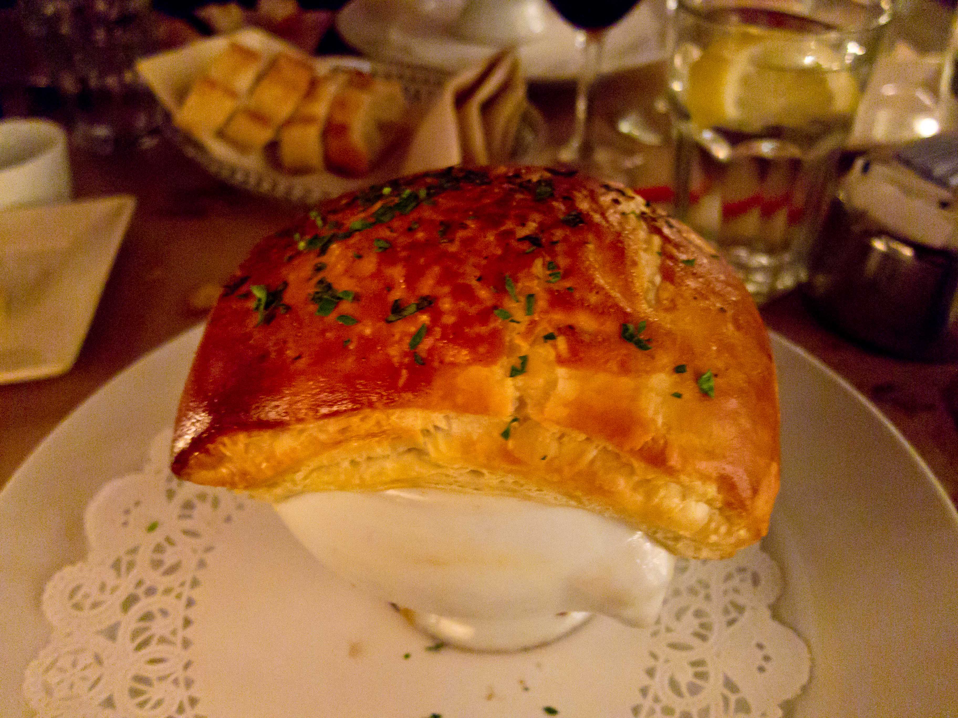La Marmite of seafood baked in puff pastry, artfully lit with two candles and a bread plate.