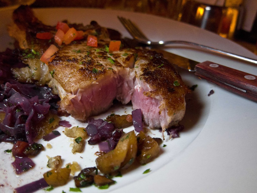 I rarely order meat when we’re out, usually I have the fish.  Le Charm, though, tempted me with their special–a pork chop.  Not just any old pork chop, but one from a local farm raising Duroc pigs, which are more of an heirloom breed.  The waitress said the chef prepared it “medium” and was that all right.  I replied that it should be medium at most, and got my wish.  I think this was the finest pork chop I have ever eaten.