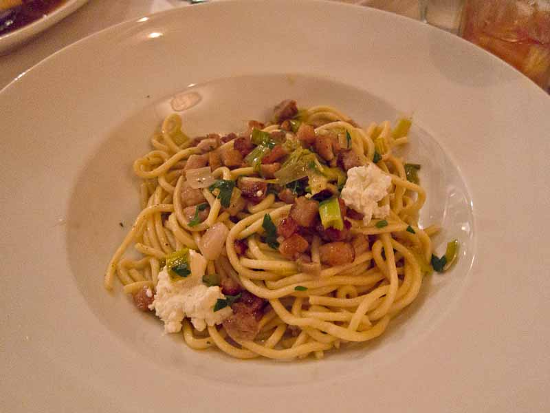 I had what was supposedly pasta alla chitarra, which would be pasta cut into thin strips on a wire assembly.  It looked more like plain old extruded spaghetti to me, and was cooked exceedingly al dente, which is polite for “not enough”.  I enjoyed the pork belly and leeks that it was dressed with, though.