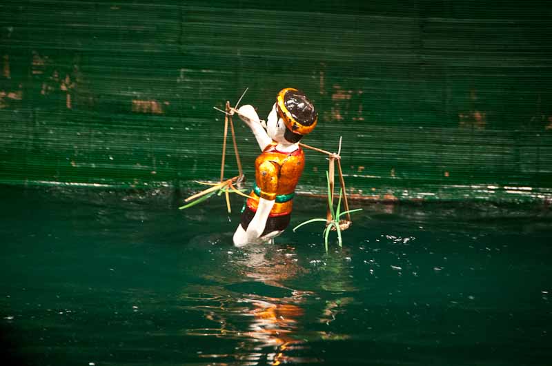 After a quick look at another temple (which looked much like the others we have seen), we had the dubious pleasure of seeing a Water Puppet show. This is a theater with a 2.5 foot deep pool covering the stage. Puppets enter from the back, and do things. What things, I don’t quite know. I think if you were a Vietnamese child, familiar with the history, mythology and archetypes of this nation, fluent in the language and still young enough to have a sense of wonder, you would really enjoy this. Since I am none of the above things, I was bored to tears. The show essentially consisted of a series of skits, wherein some puppets (which are controlled from behind a scrim by long poles under the water) enter, thrash around vigorously, then exit, sometimes after a corny vaudeville slapstick ending, sometimes just exit.
