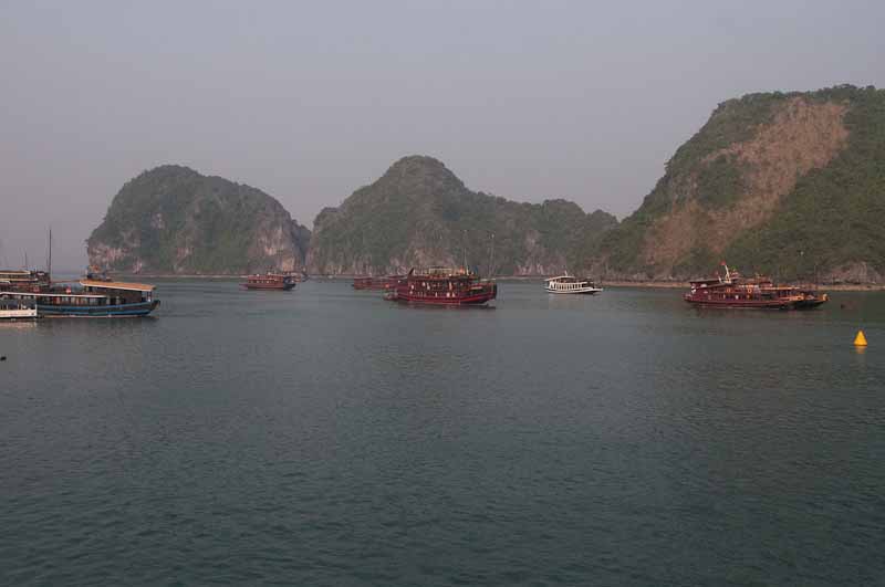 Back on the bus, we motored to Ha Long Bay, a very large body of water filled with 900+ stunning, craggy limestone islands, 2 of which are habitable. We transferred to a junk, which sounds romantic until you notice that there are 500 junks, each outfitted as a floating hotel, filling the bay. This is a huge industry, taking tourists by the tens of thousands out for an overnight trip.