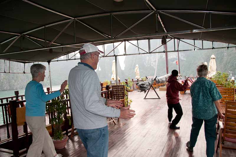 The next morning, there was a Tai Chi class at 7 am on deck. The good thing about not having anything to do in the evening is that you go to sleep early, and then get up early, so I was already up and thought I’d give it a try. We’ve all seen photos of people in China doing their morning Tai Chi, slowly and gracefully moving and stretching and breathing in a form of exercise that seems effective for a long life, isn’t exceptionally energetic and won’t lead to injuries.