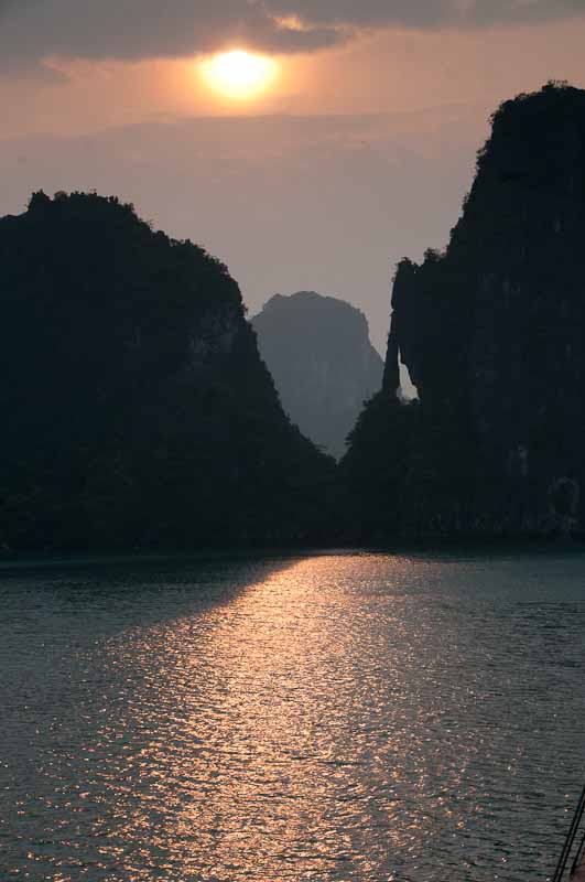 Dinner on board the boat was an adequate buffet, followed by a showing of an episode from the British car show Top Gear, where three goofballs have to drive beat up scooters from Saigon to Ha Long. It was farcical but appropriate to the moment. Now I’m sitting on the top deck of the boat typing. No internet here so this will get posted tomorrow night, but it sure is a heavenly place to write.