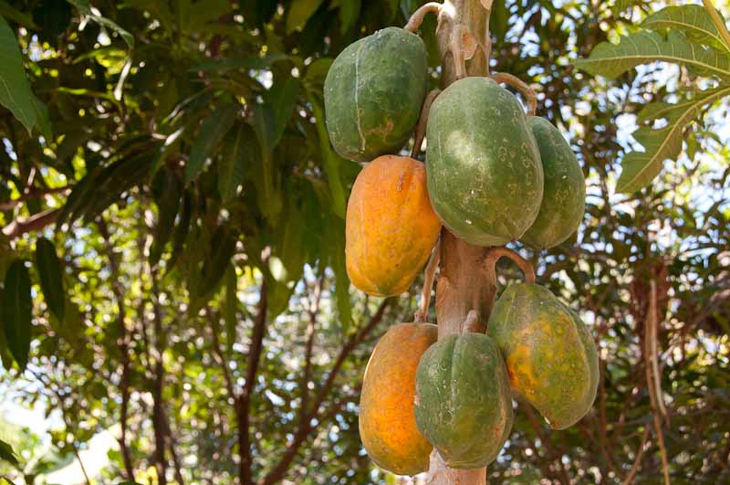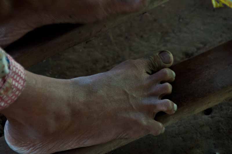 The workshops are under the house–every one has a loom. They apparently buy the thread from China, Japan or Vietnam, and can weave about 2 meters a day of cloth. The houses sit on good sized lots, and they are either gardening for themselves or truck farming, it’s hard to tell. Many of the large trees have netting underneath so you don’t get clonked in the head with falling mangoes, coconuts or papayas.