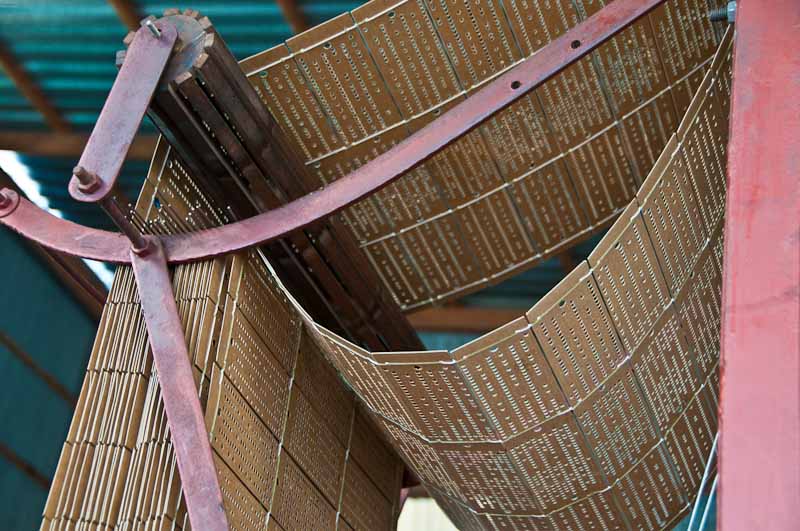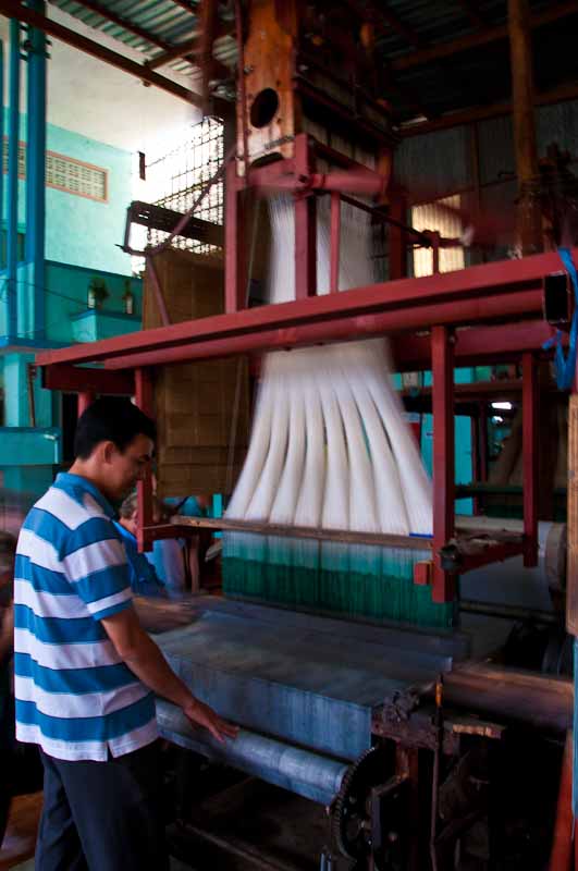 Still, somehow we got to our next destination, a silk factory. Not the place where they unwind the cocoons and make the thread, but a place where they weave the thread into fabric. Thick, heavy, plastic-feeling silk, not the thin sexy stuff you’re thinking about. The machines are, again, ancient. So old that they run on the very first kind of programming–punched cards, invented in the 19th century to control looms just like these. Hell, maybe these exact machines, they sure look old enough.