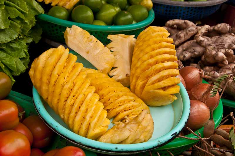 We’ve stopped in plenty of little town markets this trip, but the market in Sac De was larger and more extensive than the rest. I couldn’t bring myself to photograph the woman slaughtering chickens and ducks right on the sidewalk; my chickens at home would never forgive me. But we saw her, and the (mostly) women selling all kinds of meats, seafoods, poultry both alive and dead, fruits and vegetables. Western standards of refrigeration and hygiene are clearly unknown here, but the people seem to be surviving nicely. Maybe we worry too much.