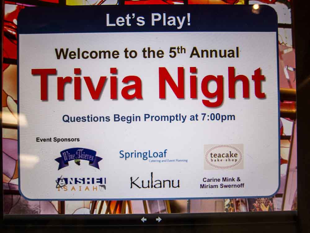 After dinner/socializing hour, came the trivia contest. This is a big annual deal, last night being the Fifth Annual. It’s a fund raiser for the temple youth fund, and I thought it was very impressively done.