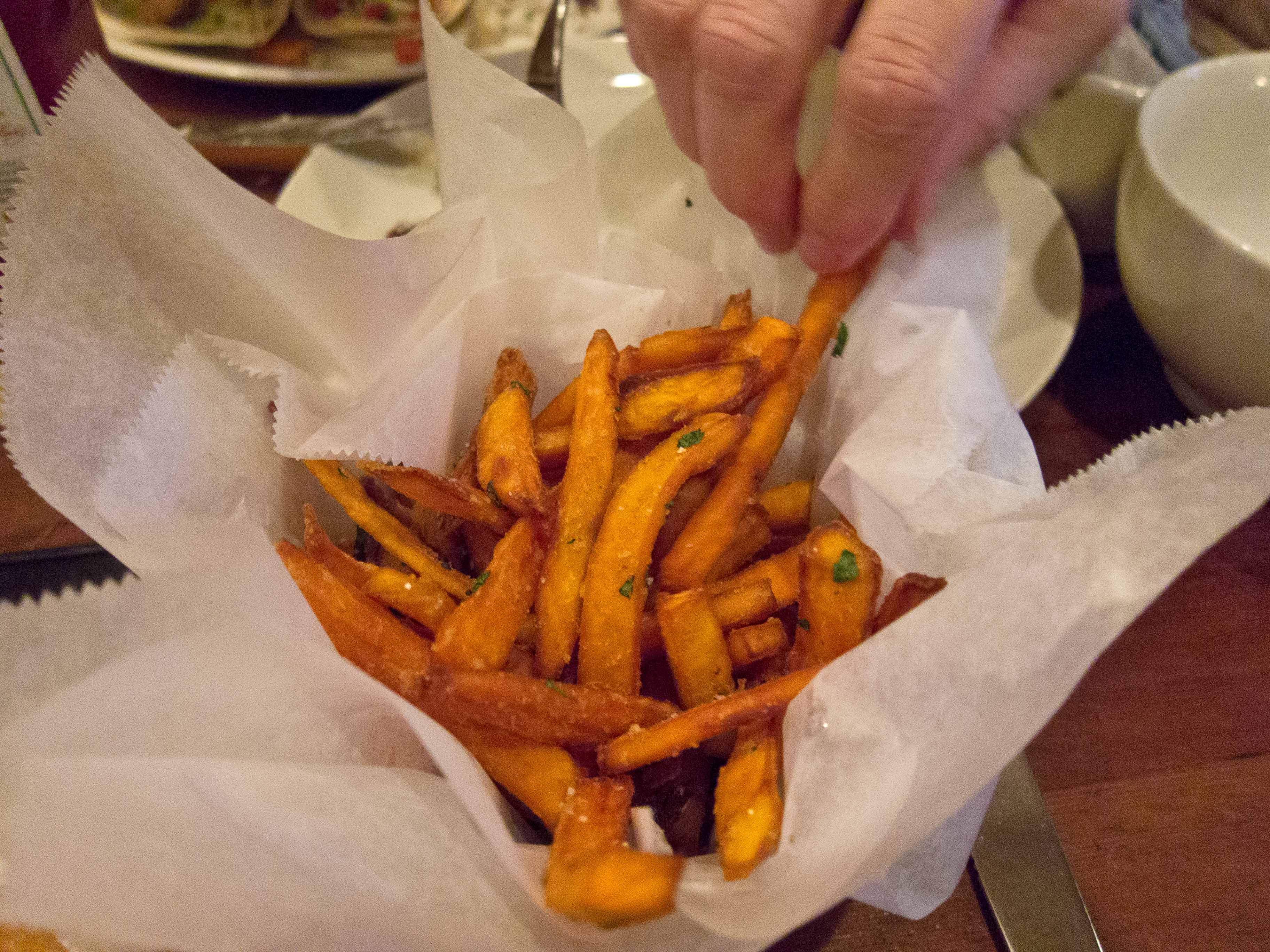 I had the grilled fish sandwich–a large piece of grilled Ahi on an enormous bun, dressed most differently with slices of some kind of citrus fruit. The bun was really too big, but the citrus salad was an interesting choice. I thought the $5.99 they charged for the side of sweet potato fries was exorbitant, but at least the fries were great.