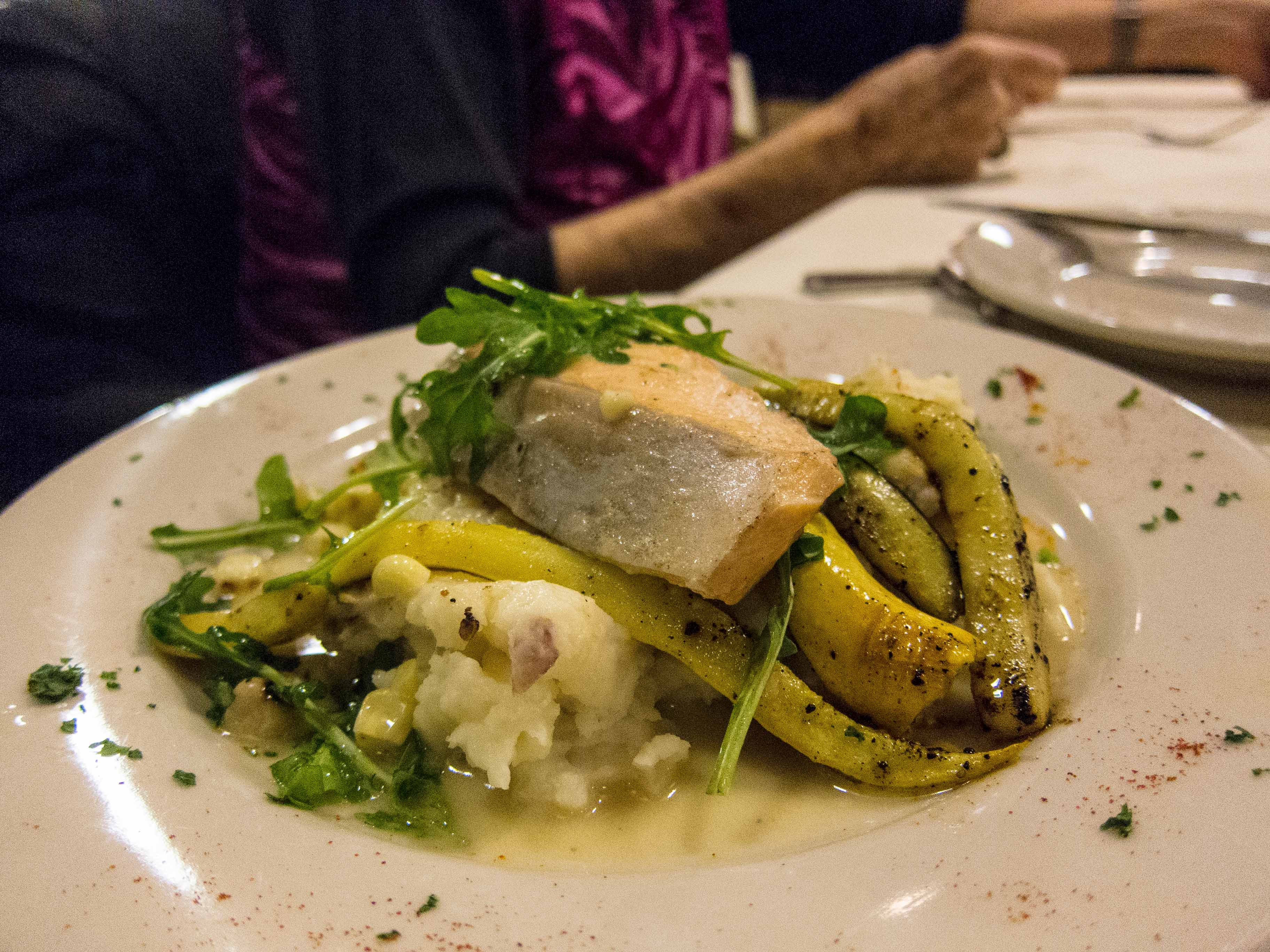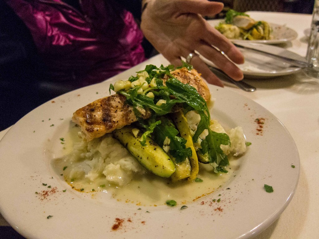 The menu was interesting–two different preparations of the same dish. Gail had the grilled salmon, Barbara had it poached.