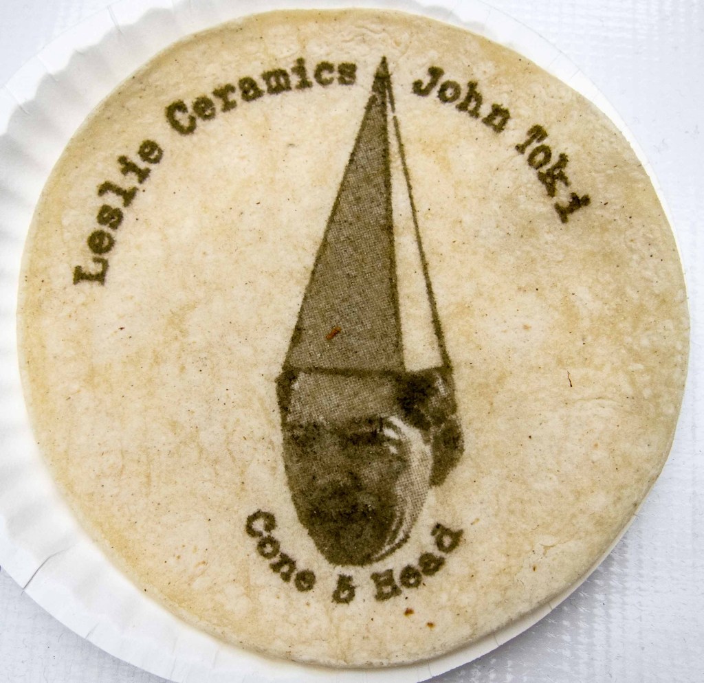 More edible art, advertising the sponsor. John Toki is the owner of Leslie Ceramics.