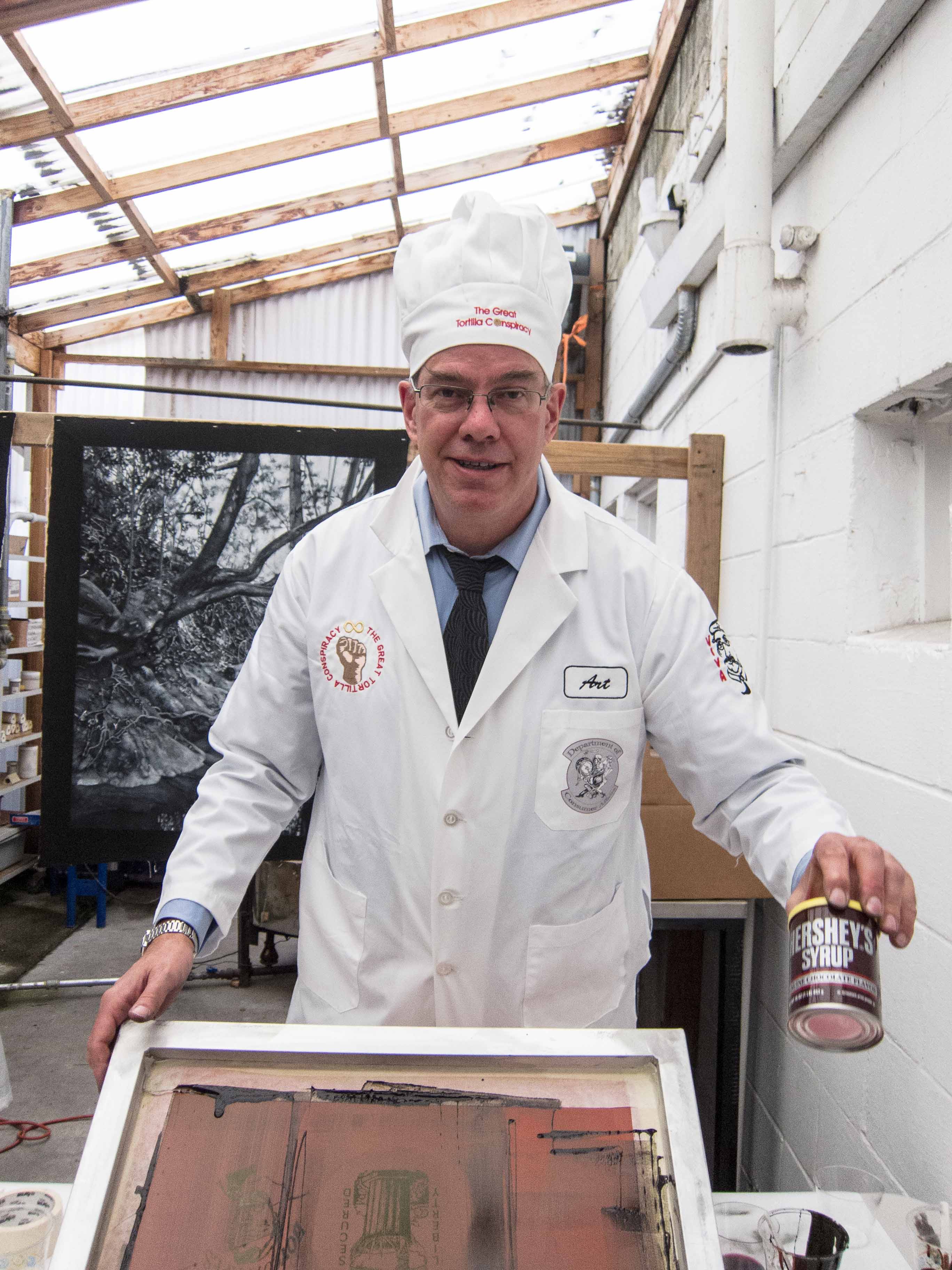The caterer, and his screen printing press. Everything is done fresh and on-site.