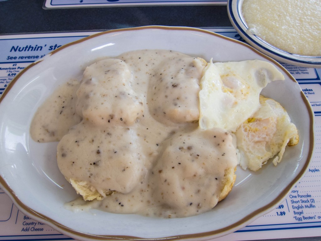 The grits were on the menu as “buttered grits”. I found another area where the purchasing manager was saving a few cents: